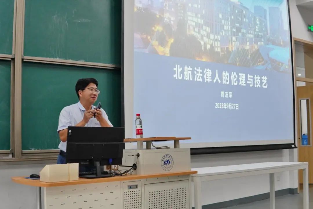 9月27日下午,法学院党委书记周友军以“北航法律人的伦理与技艺”为主题,为学院新生讲授新学期“思政第一课”,勉励同学们牢记空天报国使命、牢记法律人的责任担当,积极贡献依法治国的北航方案。