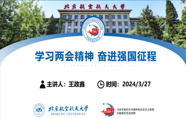3月27日, 生医学院2021级、2022级本科生联合召开主题学习日活动,邀请北航研究生宣讲团王政鑫同学为大家带来“学习两会精神,奋进强国征程”主题讲座,在生动的理论阐述和实例分析中,帮助同学们加深对全国两会精神的认识和理解。
