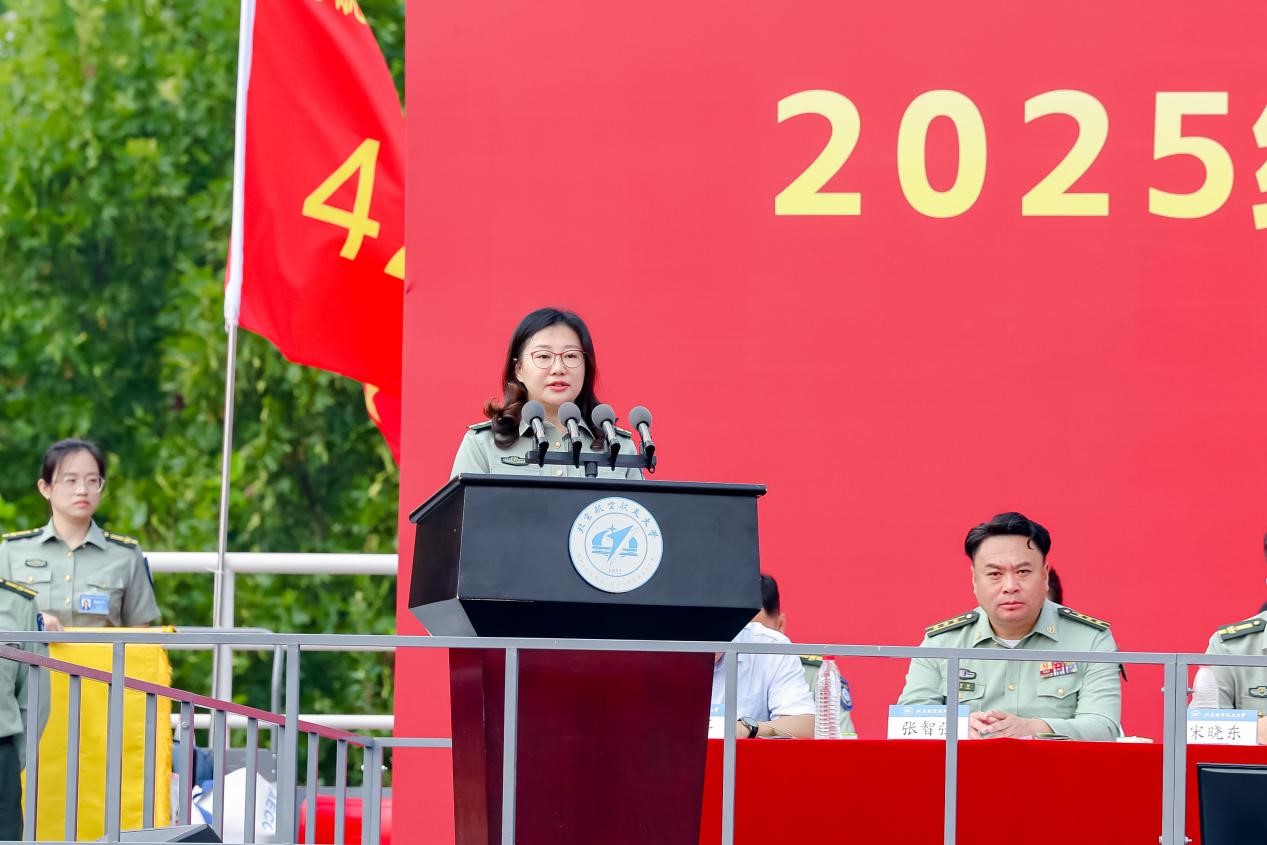 邓怡对本次军训工作进行总结,向承训部队指战员、全体带队干部致以崇高敬意,向取得优异成绩的军训团全体师生表示热烈祝贺。她表示,同学们从九三阅兵和英雄部队战旗中汲取力量,在训练中展现出坚韧意志、严明纪律和集体荣誉感。她回顾军训期间的感人场景:拉练途中同学们相互扶持、合唱比赛中齐声宣誓、集体生日会上共温情谊,这些都体现了同学们从青涩到坚毅、从个体到集体的成长历程,同时家长的来信更让大家看到了父母对同学们蜕变的自豪与感动。她向全体参训学生送上三件“军训礼物”:汗水铸就的坚韧品格、团结协作的集体精神、教官传承的家国情怀,勉励同学们赓续抗战精神、矢志空天报国,将军训中收获的意志力和使命感融入今后的学习与生活中,努力成长为担当民族复兴大任的时代新人。