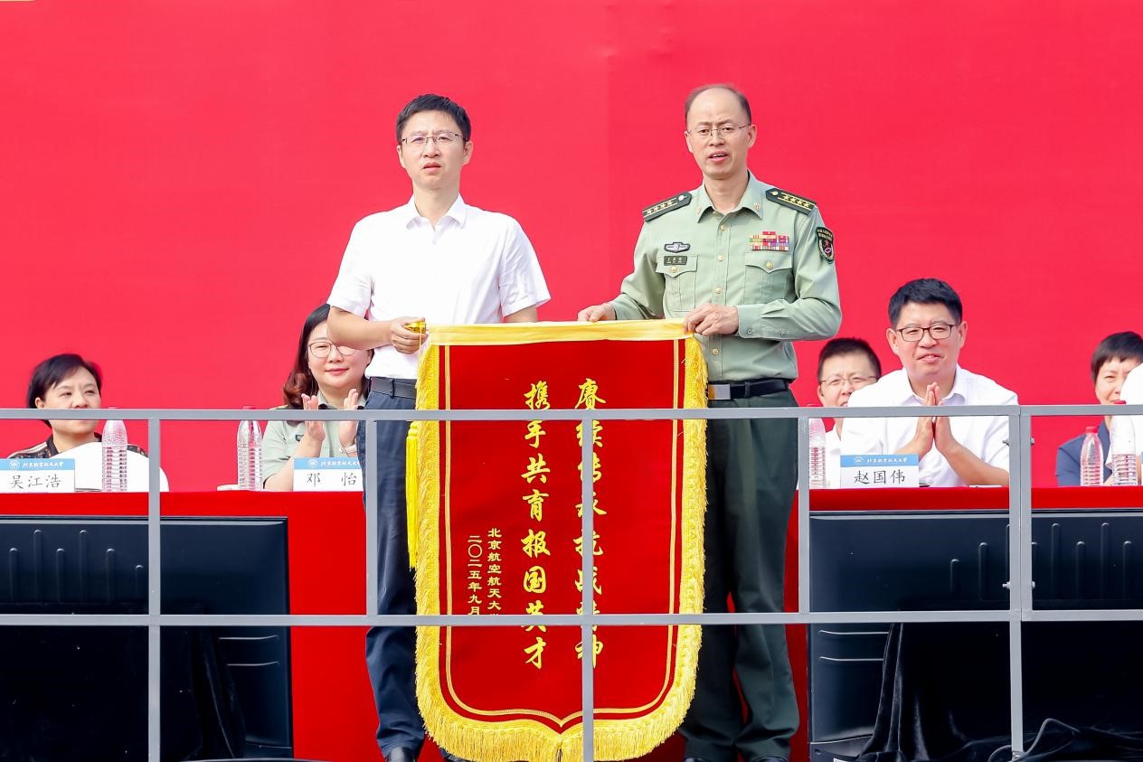 仪式最后,吴江浩代表学校向承训部队赠送锦旗,北航2025级学生军训团闭营仪式落幕。