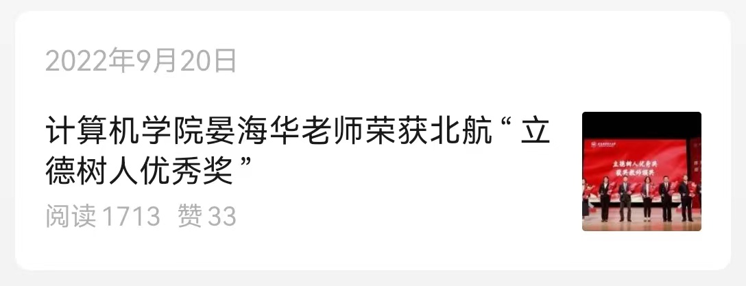 计算机学院晏海华老师荣获北航“立德树人优秀奖”