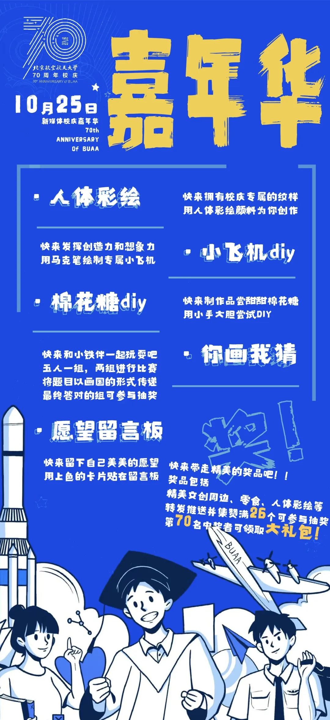 【70周年校庆】你有一份新媒体校庆嘉年华攻略待签收:校庆嘉年华将于10月25日举行,人体彩绘、一起画小飞机、亲手制作棉花糖、帆布袋、文件夹、贴纸、钥匙扣、卡套、明信片、勋章、笔记本等文创产品,让我们共同祝愿北航生日快乐,阅读量7000+。
