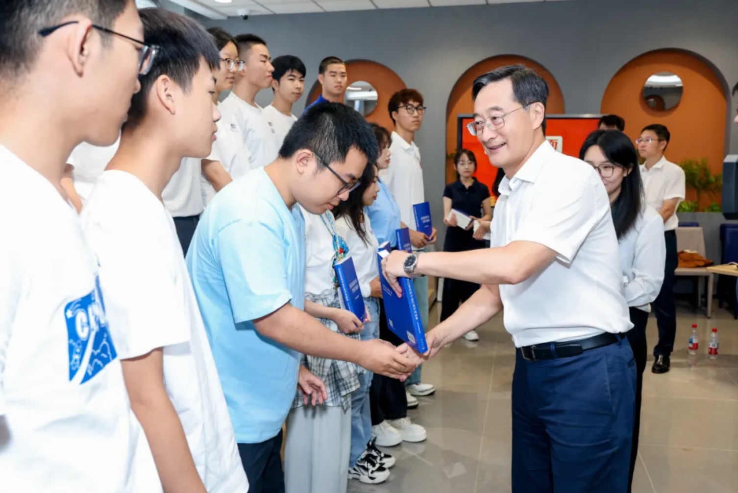 座谈会后,赵长禄、王云鹏为新生代表们赠送书籍《百位著名科学家作风学风故事》,并与同学们合影留念。