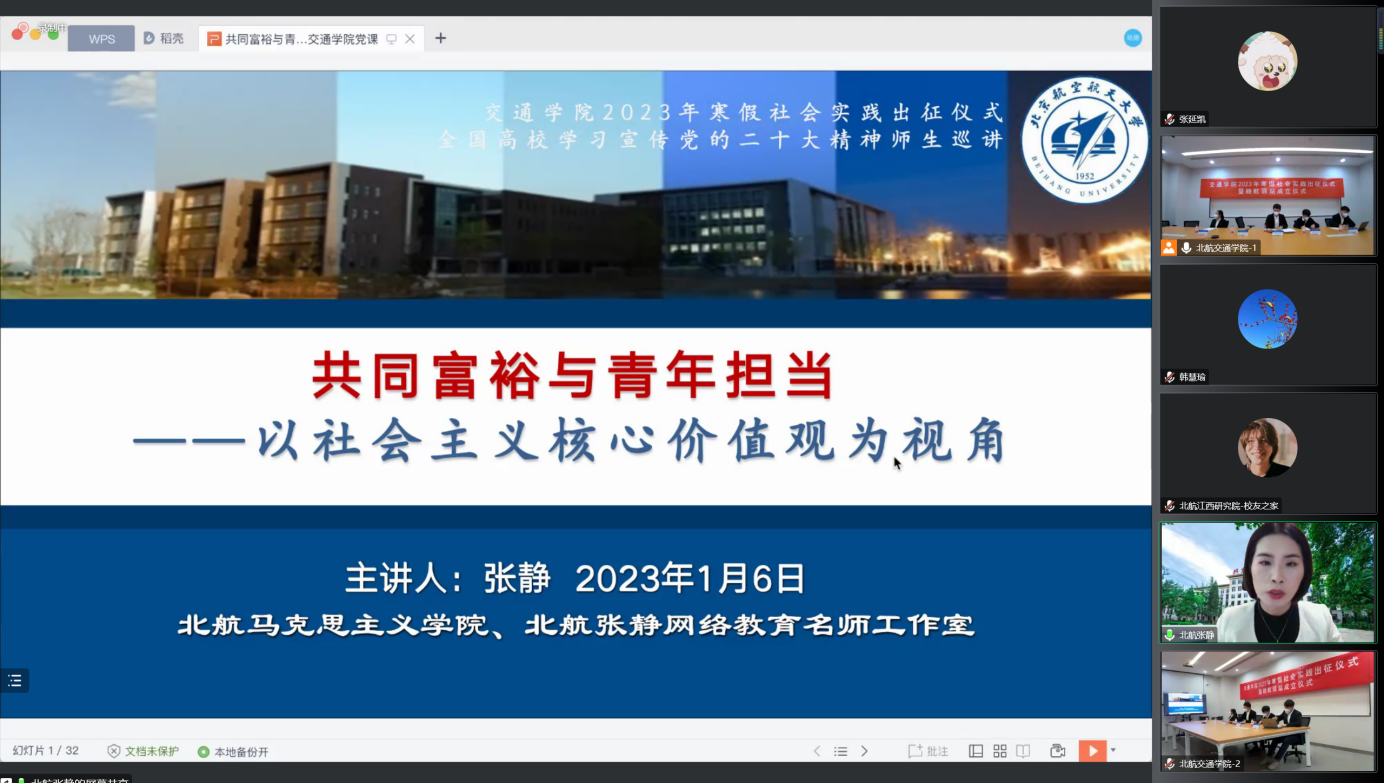 1月6日下午,交通学院2023年寒假社会实践出征仪式暨“赣航驿站”成立仪式于沙河校区主楼A405、江西研究院校友之家和线上会场同步举行。仪式由交通学院党委副书记郭祖博和江西校友会秘书长胥清皓主持。
