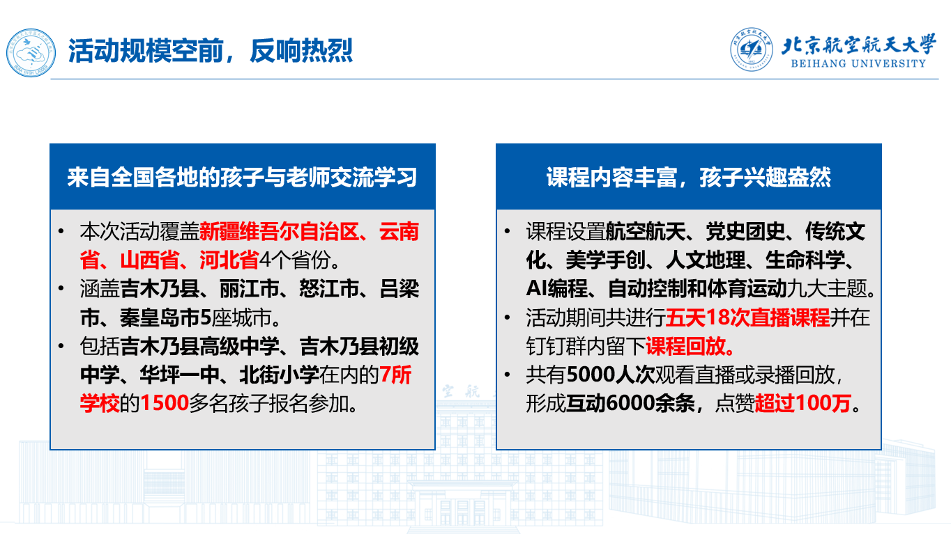 此次支教包括线上科普冬令营和线下科普宣讲活动两部分,线上冬令营的课程包括航空航天、党史团史、传统文化、美学手创、人文地理、生命科学、AI编程、自动控制和体育运动九大主题,队员们力求通过丰富多彩的课程,让同学们了解国防重器的迅猛发展、科学技术的奥妙有趣、传统美学的方正典雅,从而激发青少年的好奇心、求知欲、探索欲,增强民族自豪感和文化自信心。