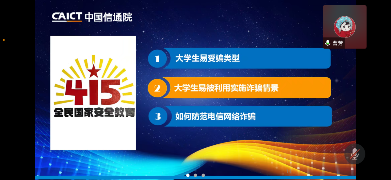 讲座从《网络安全法》的总体情况和重点制度两方面入手进行了系统深入的解读,进一步增强了学生积极维护国家安全的意识,营造了维护国家安全的浓厚氛围,增强了学生防范和抵御安全风险的能力。防范电信网络诈骗部分用生动的案例展示了大学生易受骗类型和易被利用实施诈骗场景,教导学生如何去防范电信诈骗,使学生对电信网络诈骗犯罪活动有了更为清醒深刻的认识,进一步增强了学生防范电信网络诈骗犯罪的意识,筑牢了防范打击电信、网络诈骗违法犯罪的坚固屏障。