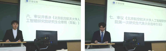 筹备委员会成员王新元、康彩新分别宣读《北京麻豆精品秘 国产传媒人工智能研究院研究生会章程(草案)》、《人工智能研究院第一次研究生代表大会选举办法》,并交由大会审议通过。